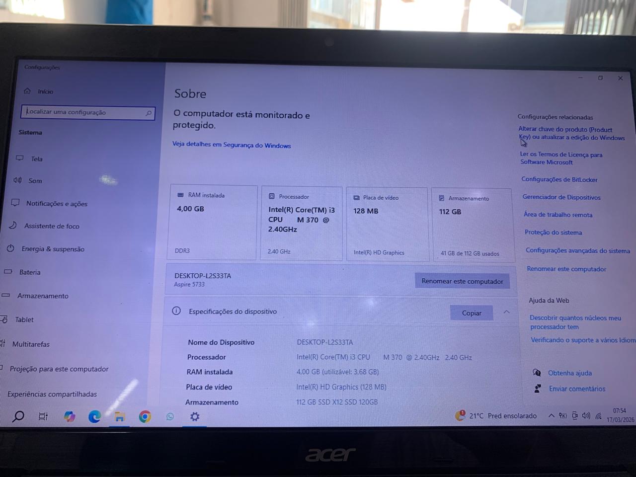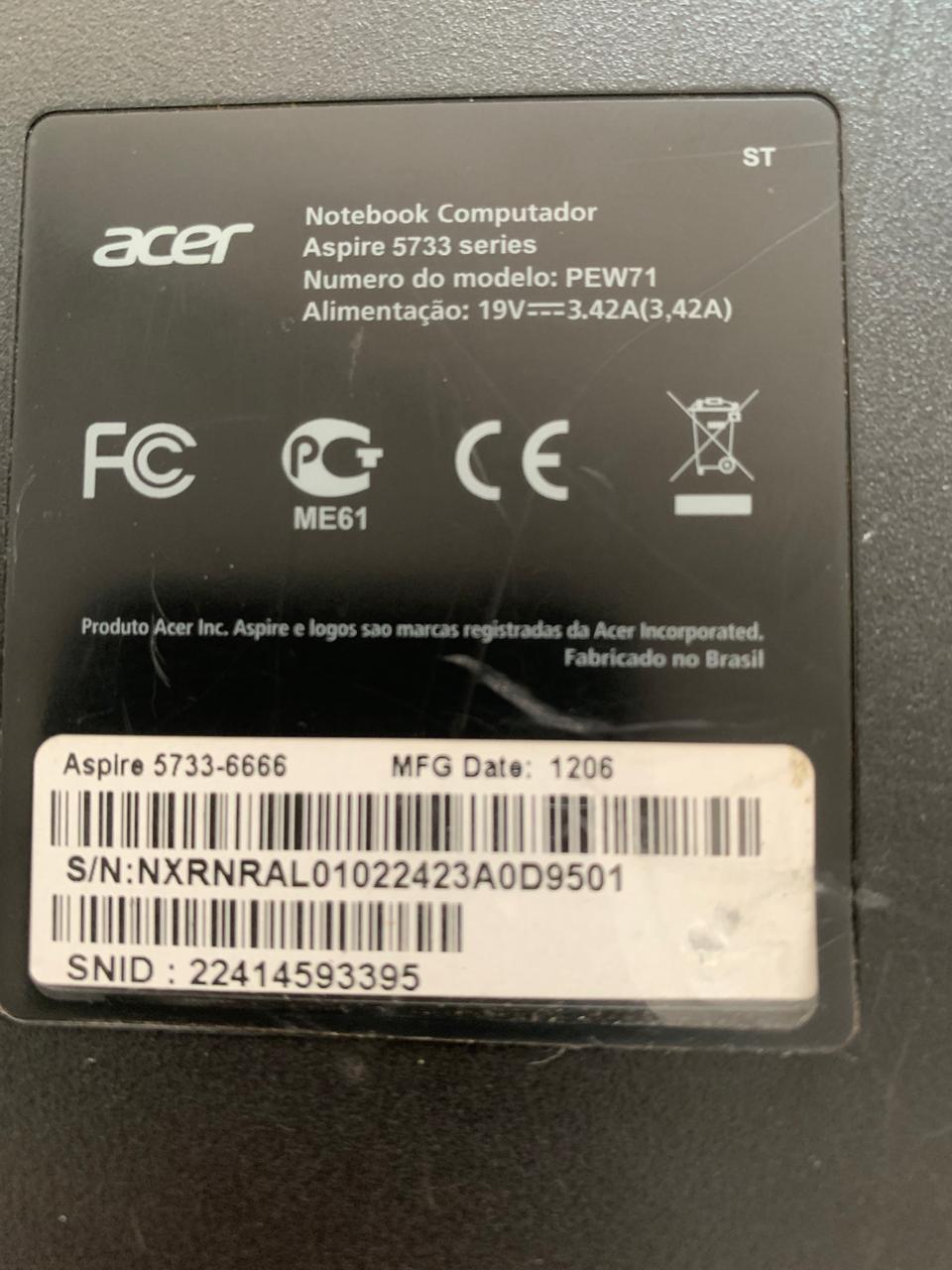 NOTEBOOK ACER ASPIRE 5733-6666 I3 2.4GHz 4GB MEMÓRIA SSD 120GB
