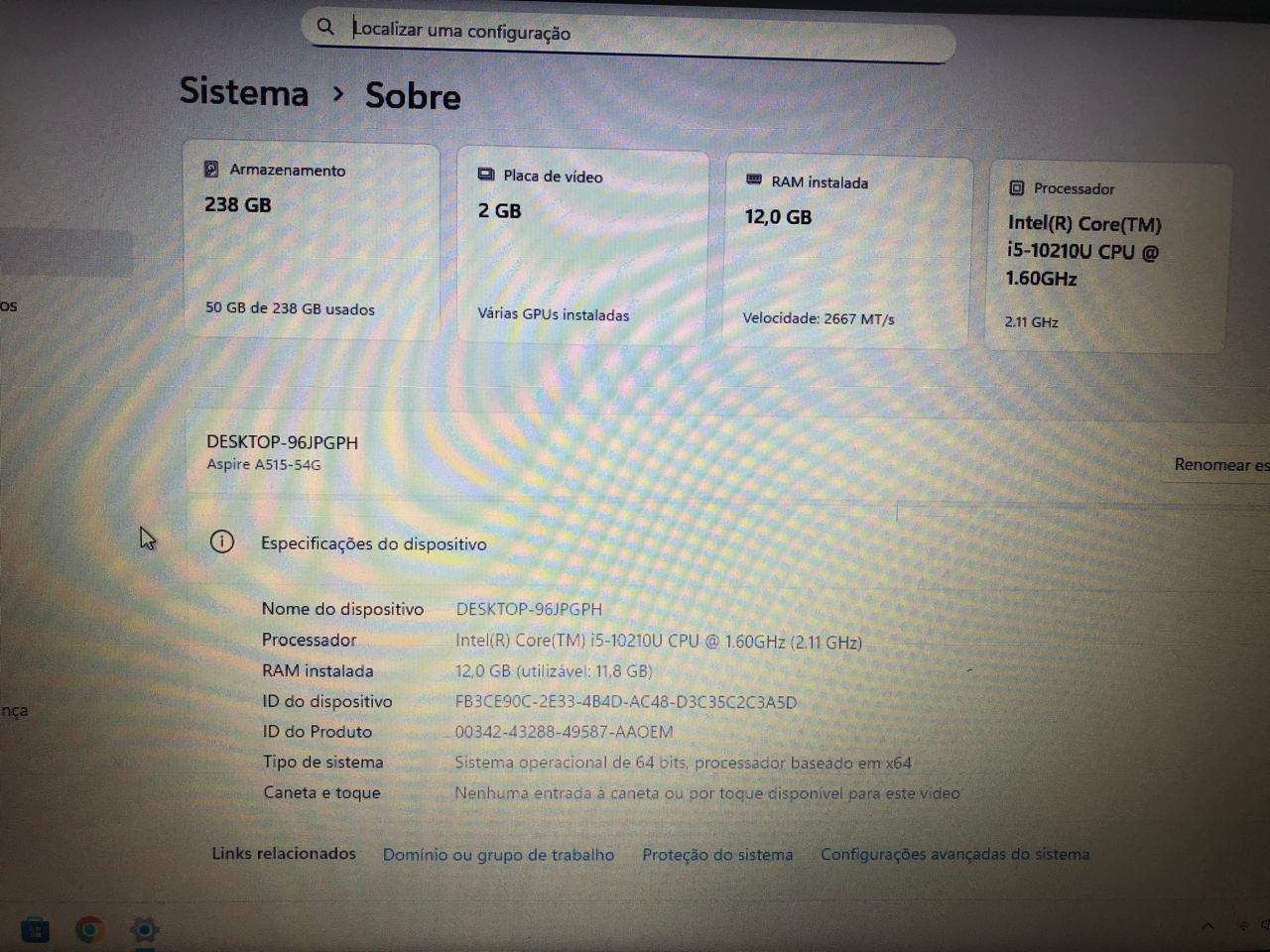 NOTEBOOK ACER CORE I5-10210U 2.11GHz 12GB MEMÓRIA SSD NVME 256GB PLACA DE VIDEO MX250 2GB
