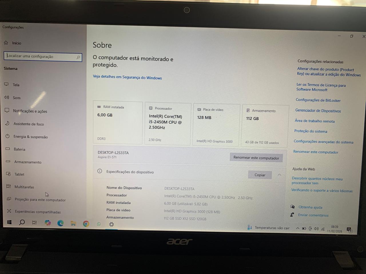 NOTEBOOK ACER E1-571 I5-2450M 6 GB MEMÓRIA SSD 120GB
