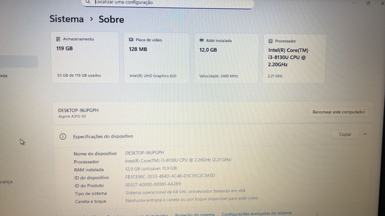 NOTEBOOK ACER I3-8130U 2.2GHz 12GB MEMÓRIA SSD NVME 128GB