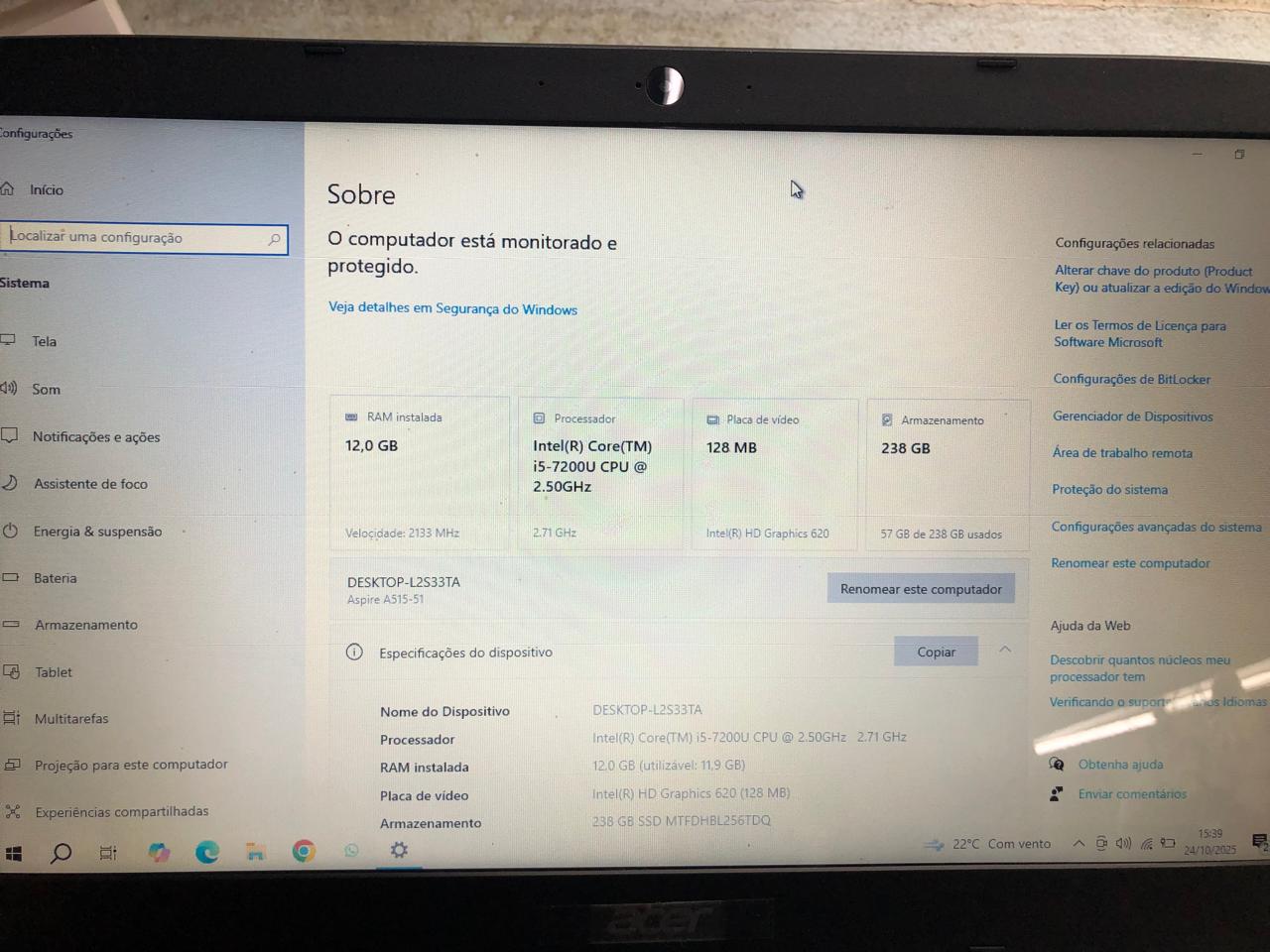 NOTEBOOK ACER I5-7200U 2.5GHz 12GB MEMÓRIA SSD NVME 256GB