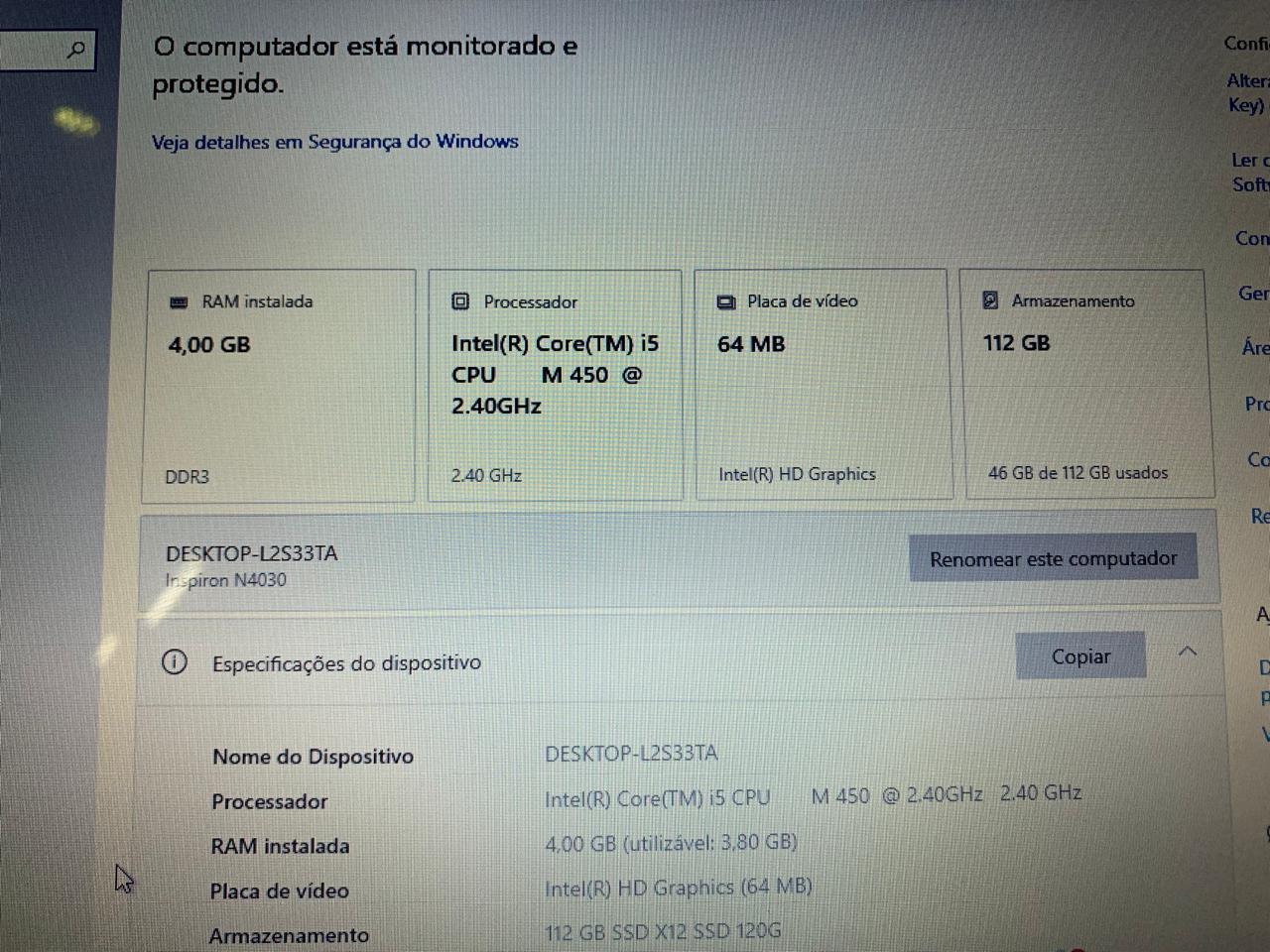 NOTEBOOK DELL N4030 I5 2.4GHz MEMÓRIA 4GB SSD 120GB