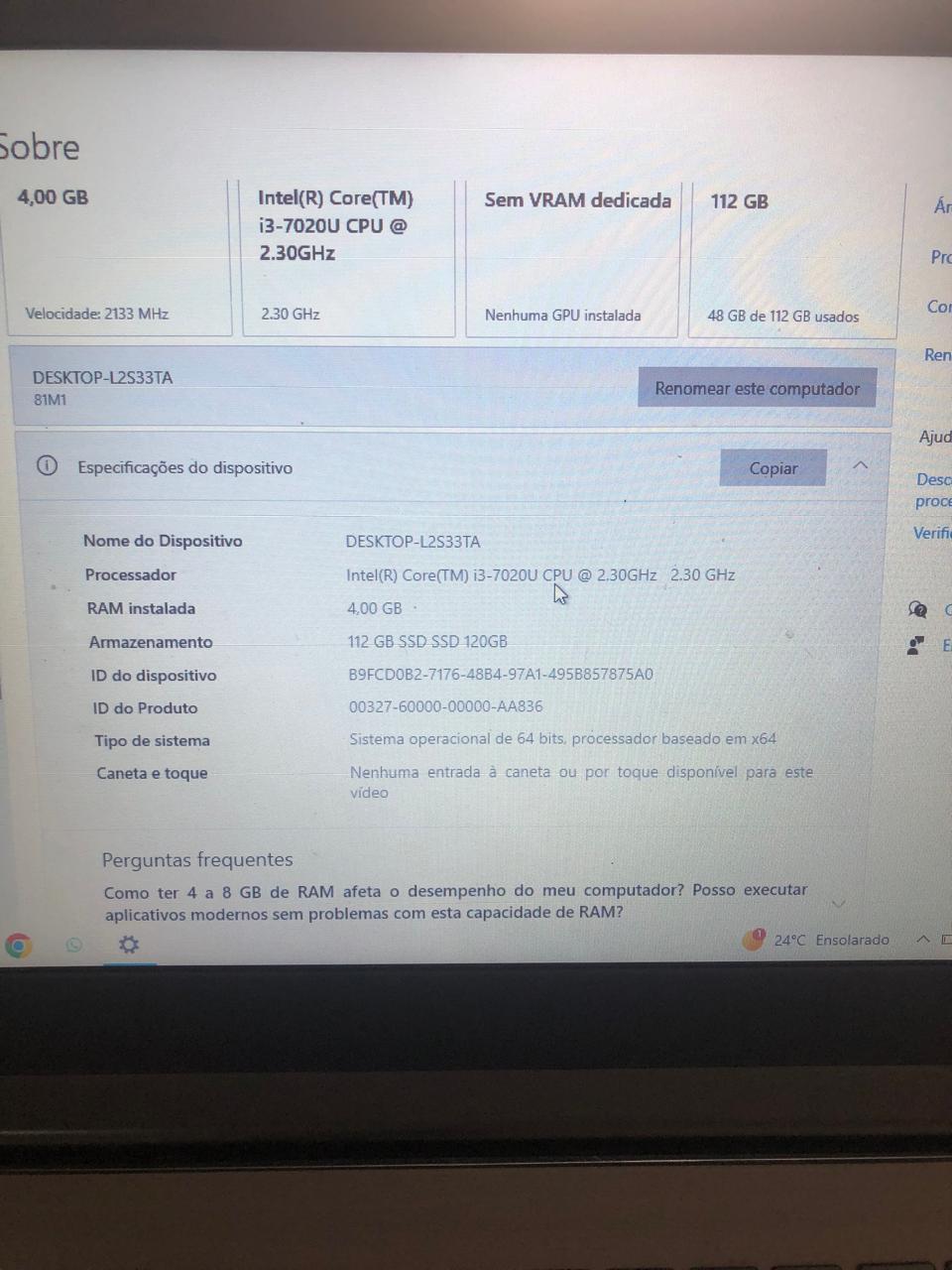 NOTEBOOK LENOVO I3-7020U 2.3GHz 4GB MEMÓRIA SSD 120GB